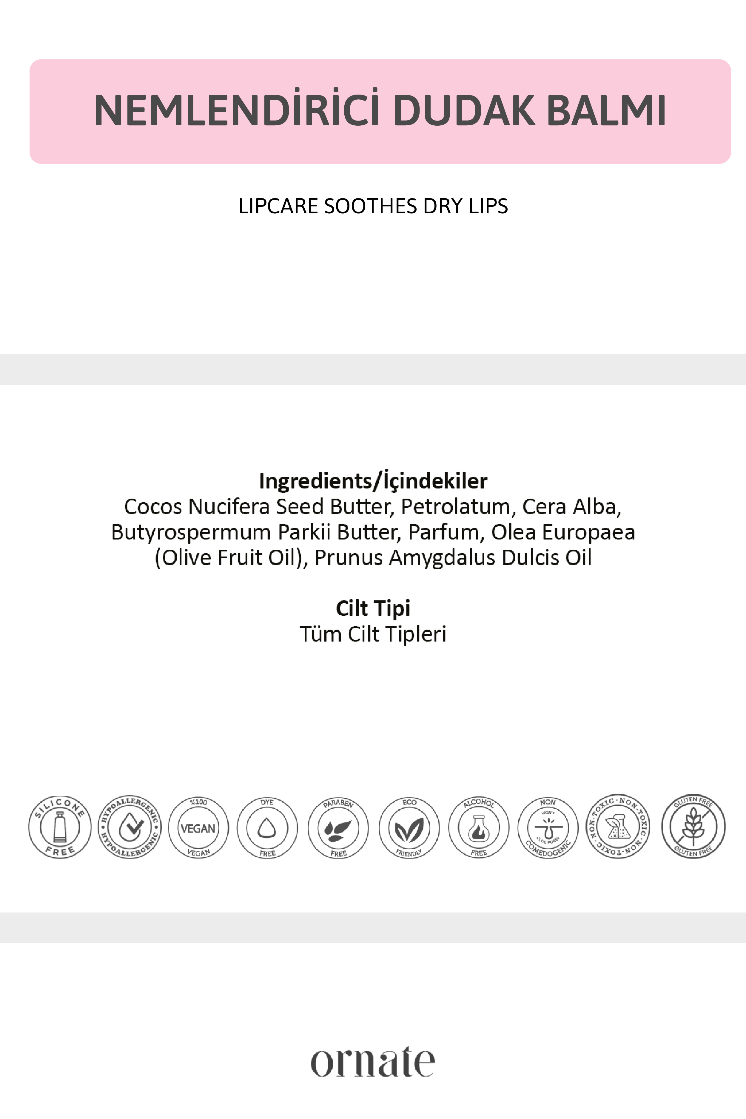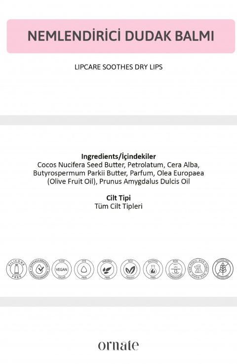Ornate Dudak Balmı, dudak bakımını günlük rutinin keyifli bir parçasına dönüştürür. 🧴✨ Özel formülü sayesinde dudakları nemlendirir, kuruluğu önler ve ipeksi bir yumuşaklık sağlar. Hafif ve pratik yapısıyla gün boyu kolayca kullanılabilir.