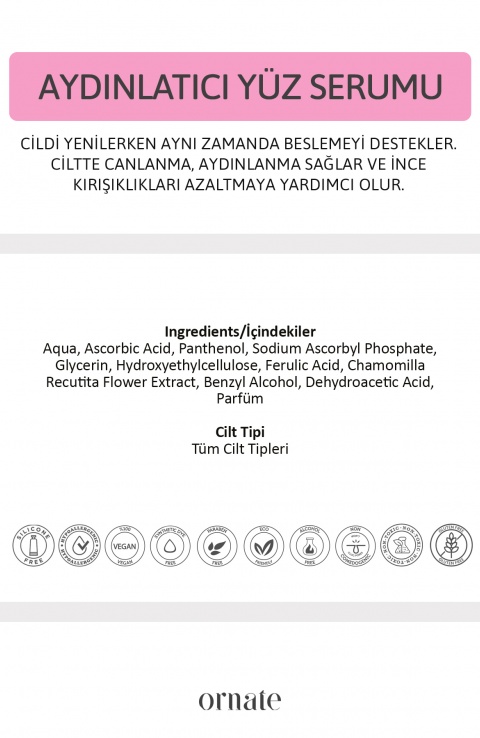 C vitamini Serum, cilt için en güçlü serumlardan biridir. Ornate Pinky C Serum, %10 Askorbik Asit, %0.5 Ferulik Asit ve prebiyotikler ile zenginleştirilmiş formülü sayesinde cildinizi aydınlatırken besler ve yeniler.